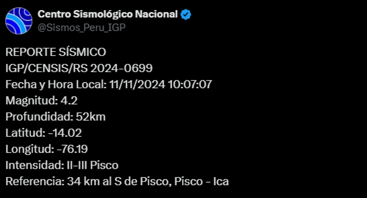 El Instituto Geofísico del Perú (IGP) dio a conocer un temblor de magnitud 4,2, a 34 kilómetros al sur de Pisco, Ica. Este movimiento telúrico se produjo a las 10.07 a. m. y tuvo una profundidad de 52 kilómetros.