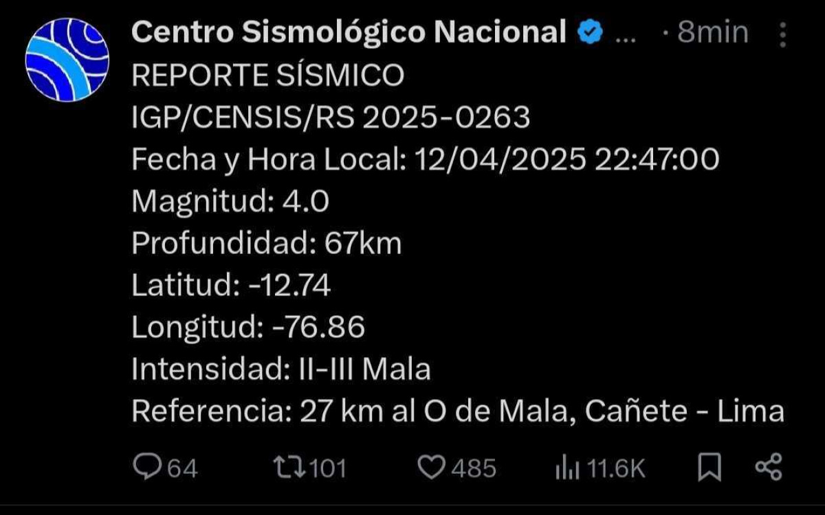 Temblor de hoy, sábado 12 de abril, en Perú: últimas noticias EN VIVO