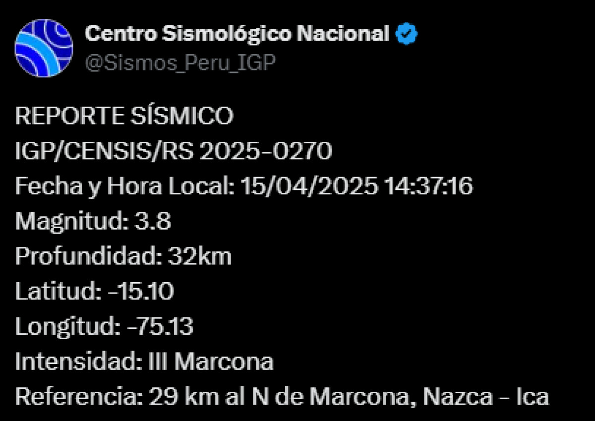 Un sismo de magnitud 3,8 se registró a las 2.37 p. m. a 29 kilómetros al norte de Marcona, Nazca - Ica. El temblor del 15 de abril del 2025, se registró a una profundidad de 32 kilómetros, según informó el Instituto Geofísico del Perú (IGP) vía Twitter. Recuerda tener siempre lista una mochila de emergencia para estar preparado ante un desastre natural.