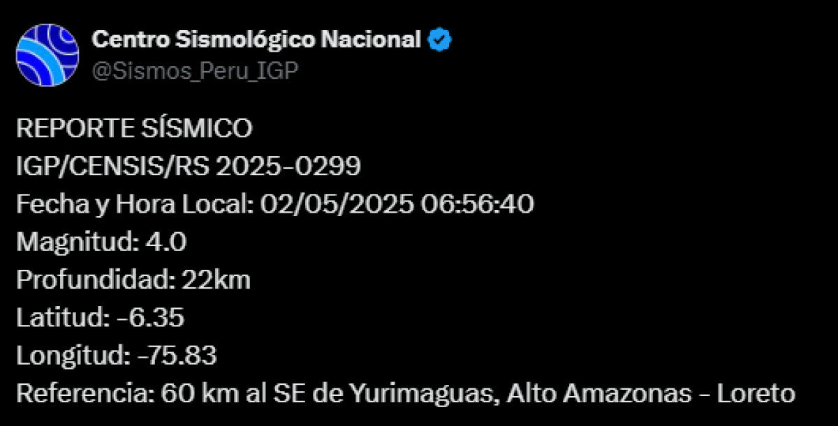 Un sismo de magnitud 4,0 se registró a las 6.56 a. m. a 60 kilómetros al suroeste de Yurimaguas, Alto Amazonas - Loreto. El temblor de hoy, 2 de mayo de 2025 , se registró a una profundidad de 22 kilómetros, según informó el Instituto Geofísico del Perú (IGP) vía Twitter. Recuerda tener siempre lista una mochila de emergencia para estar preparado ante un desastre natural.