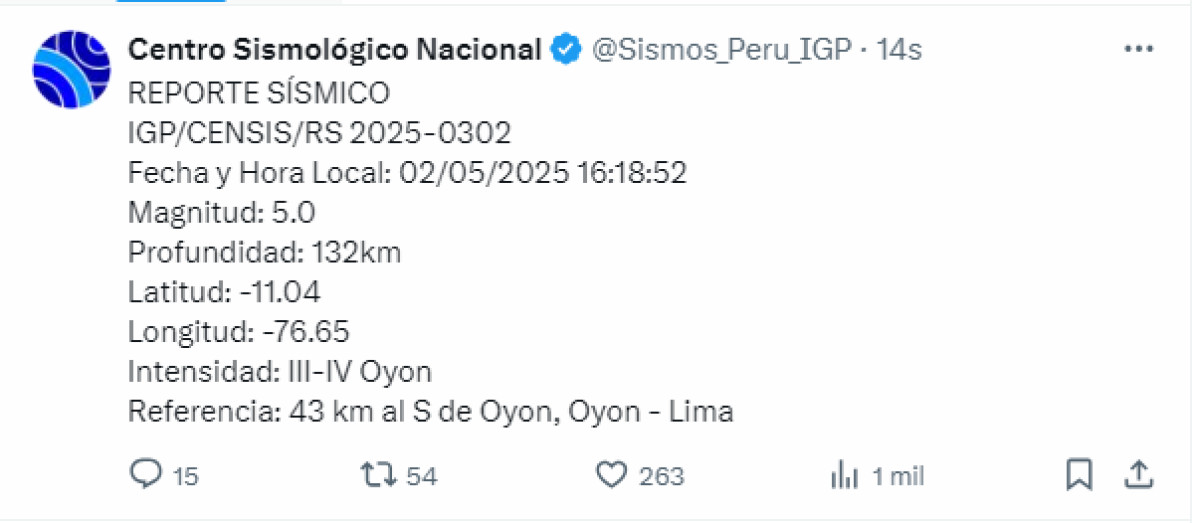 El Instituto Geofísico del Perú (IGP) reportó un nuevo sismo de magnitud 5,0. Este movimiento telúrico tuvo como referencia a 43 kilómetros al sur de Oyón, Lima y una profundidad de 132 kilómetros.