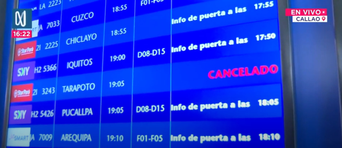En las últimas horas, el nuevo aeropuerto Jorge Chávez sumó vuelo canc hacia Santiago de Chile y otro nacional a Tarapoto, elevando a aproximadamente 20 el total de cancelaciones desde ayer, principalmente de la aerolínea LATAM.