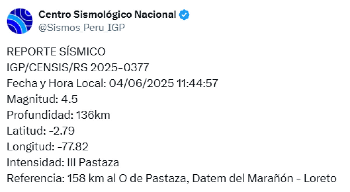 Un movimiento telúrico de 4,5 se registró a las 11.44 a. m. a 158 kilómetros al oeste de Pastaza, en Loreto. El temblor del 4 de junio se registró a una profundidad de 136 kilómetros, según informó el Instituto Geofísico del Perú (IGP) vía Twitter. Recuerda tener siempre lista una mochila de emergencia para estar preparado ante un desastre natural.