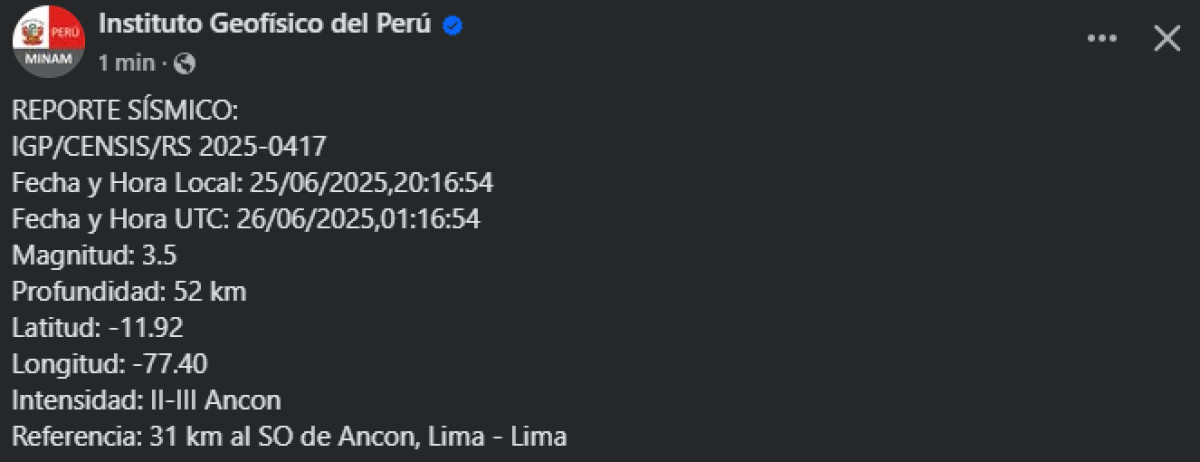 Temblor en Ancón HOY, 25 de junio 2025: IGP reportó movimiento telúrico de 3.5
