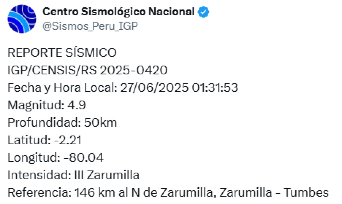 Un sismo de magnitud 4,9 se registró a las 01.31 p. m. a 146 kilómetros al norte de Zarumilla en Tumbes. El temblor del viernes 27 de junio de 2025, se registró a una profundidad de 50 kilómetros, según informó el Instituto Geofísico del Perú (IGP) vía Twitter. Recuerda tener siempre lista una mochila de emergencia para estar preparado ante un desastre natural.