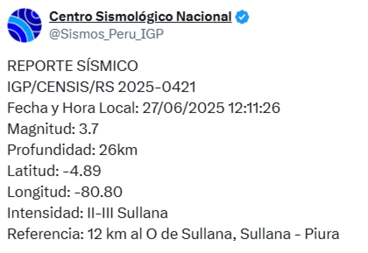 Un sismo de magnitud 3,7 se registró a las 12.11 p. m. a 146 kilómetros al oeste de Sullana en Piura. El temblor del viernes 27 de junio de 2025, se registró a una profundidad de 26 kilómetros, según informó el Instituto Geofísico del Perú (IGP) vía Twitter. Recuerda tener siempre lista una mochila de emergencia para estar preparado ante un desastre natural.