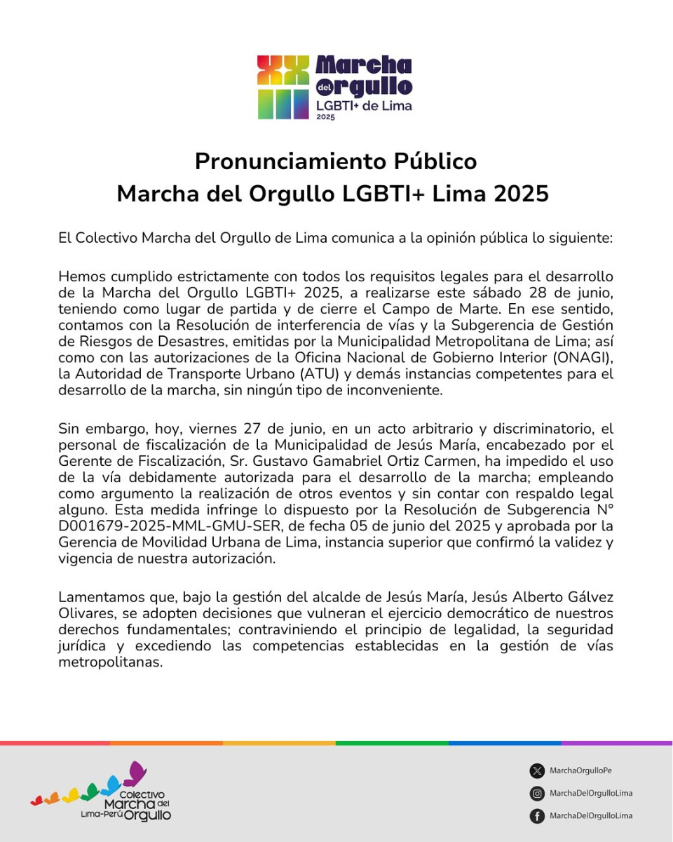 El colectivo Marcha del Orgullo se pronunció luego de que la Municipalidad de Jesús María impidiera el uso de la vía autorizada para el desarrollo de la movilización.