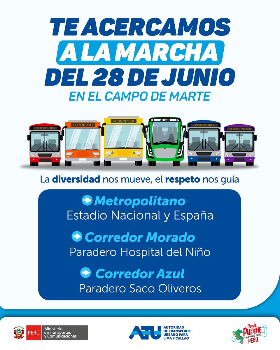 La ATU ha confirmado que los corredores azul y morado; así como los buses del Metropolitano, trasladarán al público que desee asistir a la Marcha del Orgullo que se realizará hoy sábado 28 de junio en el Campo de Marte.