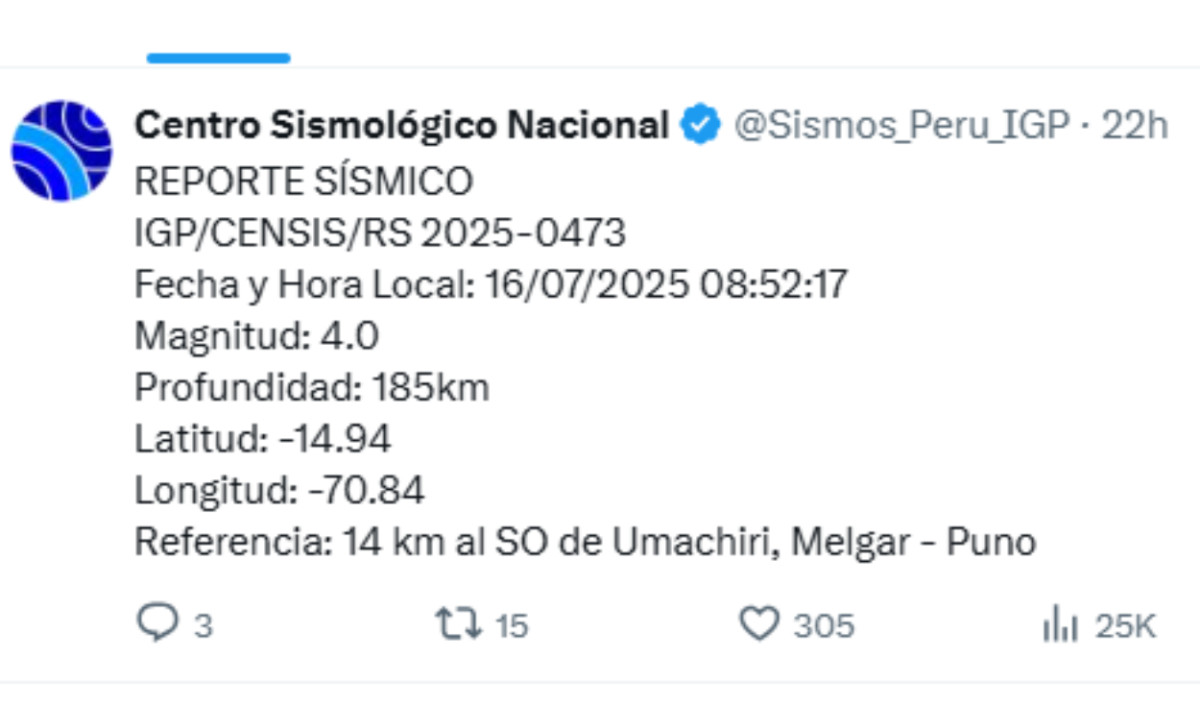 De acuerdo con el reporte del Instituto Geofísico del Perú, la ciudad de Puno registró un sismo de magnitud 4,0 el miércoles 16 de julio. El movimiento telúrico ocurrió a 14 km al suroeste de Umachiri, Melgar.