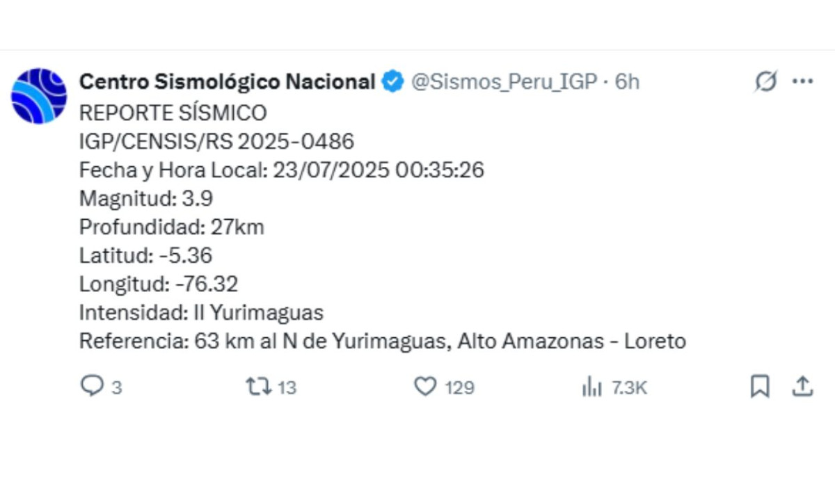 Un sismo de magnitud 3,9 se registró a las 00.35 a. m. a 63 kilómetros al norte de Yurimagua, Alto Amazonas - Loreto. El temblor del 23 de julio de 2025, se registró a una profundidad de 27 kilómetros, según informó el Instituto Geofísico del Perú (IGP) vía Twitter. Recuerda tener siempre lista una mochila de emergencia para estar preparado ante un desastre natural.