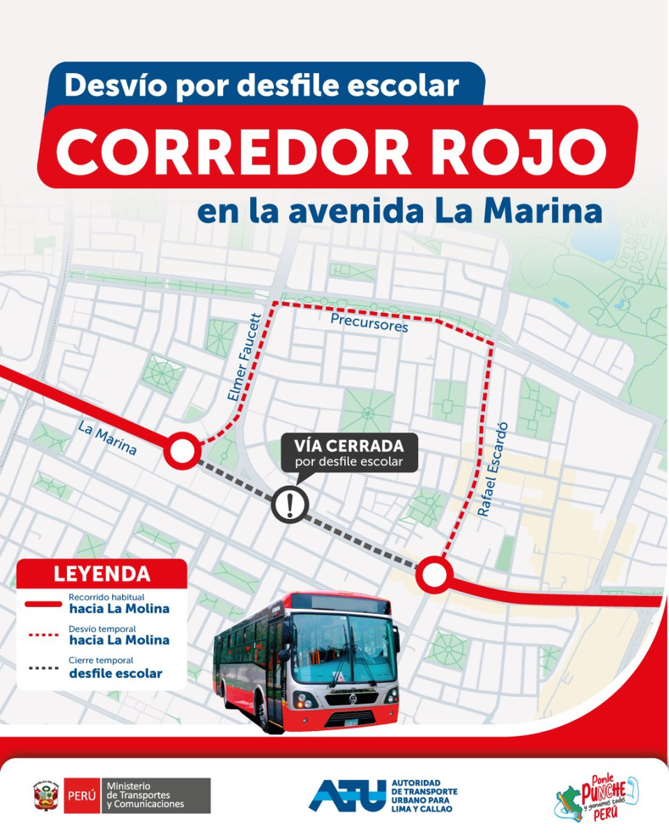 La Autoridad de Transporte Urbano reportó congestión vehicular en la avenida La Marina debido a un desfile escolar en el sector. En consecuencia, este será es desvío del servicio 201 del corredor Rojo: