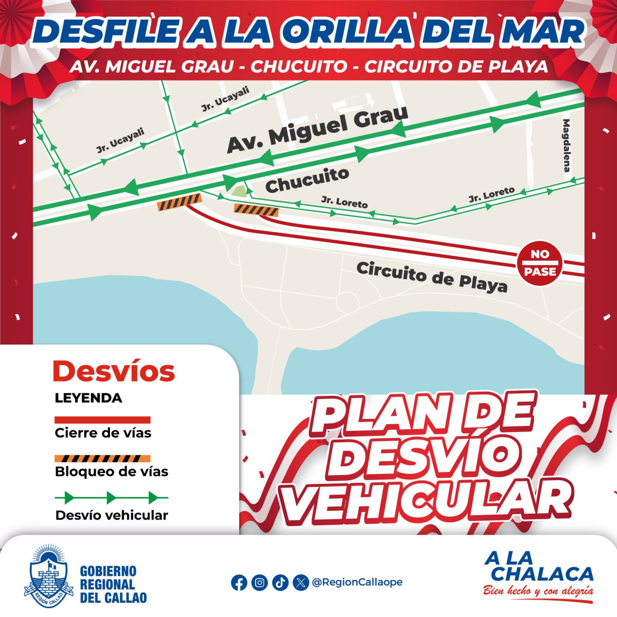 El gobierno regional compartió el mapa del desvío por el desfile a la orilla del mar en la av. Miguel Grau, Chucuito, en el Callao: