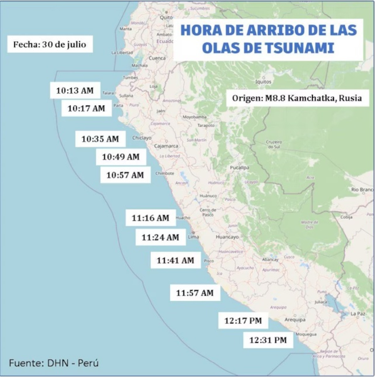La Dirección de Hidrografía y Navegación de la Marina de Guerra del Perú emitió una alerta de tsunami para el litoral peruano, tras el terremoto de magnitud 8,8 registrado el último 29 de julio en la ciudad de Petropavlovsk-Kamchatsky, en Rusia. Según el Centro de Alerta de Tsunamis del Pacífico, se prevé la llegada de olas con alturas estimadas entre 1.0 y 3.0 metros durante la mañana de este miércoles 30 de julio.