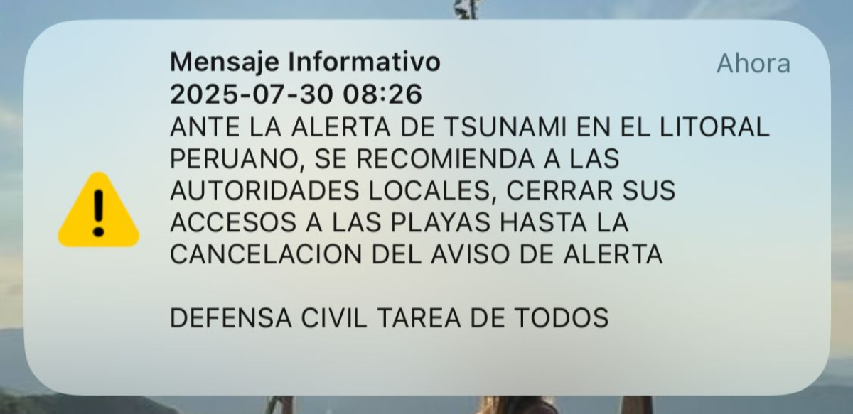 A través de mensajes informativos enviados a los celulares, alrededor de las 8 de la mañana llegó una alerta de tsunami para el litoral peruano. El mensaje señalaba: "Se recomienda a las autoridades locales cerrar sus accesos a las playas hasta la cancelación del aviso de alerta".