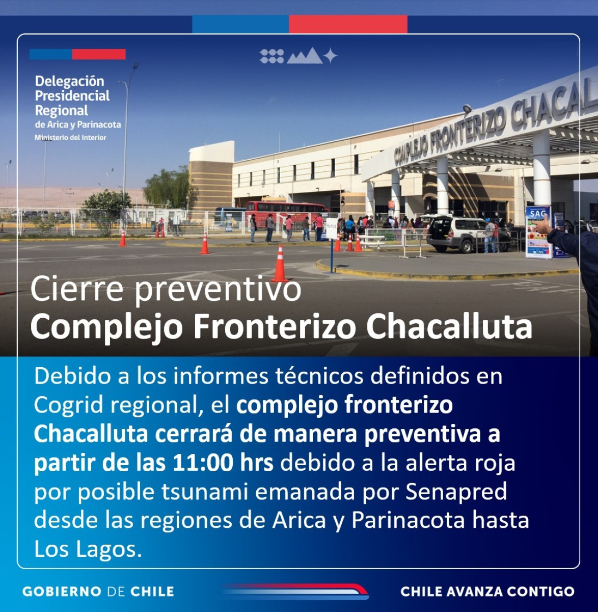 El complejo fronterizo Chacalluta cerrará de manera preventiva a partir de las 11:00 a.m., debido a la alerta roja por posible tsunami emitida por Senapred, que abarca desde las regiones de Arica y Parinacota hasta Los Lagos.