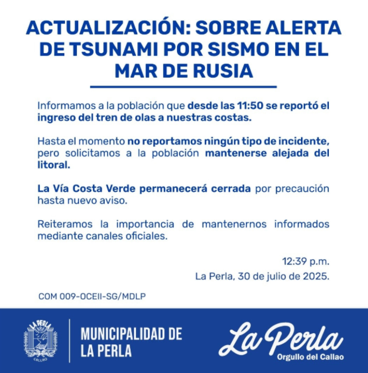 La Municipalidad de La Perla emitió una actualización tras la alerta de tsunami y el ingreso del tren de olas registrado a las 11:50 a.m. En su comunicado, informó que “no se ha reportado ningún tipo de incidente, pero solicitamos a la población mantenerse alejada del litoral”. Asimismo, recordó que la vía Costa Verde permanecerá cerrada hasta nuevo aviso.