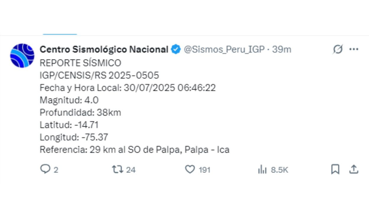 Un sismo de magnitud 4.0 sacudió Ica. De acuerdo con los registros del Centro Sismológico Nacional, el epicentro ocurrió 29 km al suroeste de Palpa, Palpa - Ica.