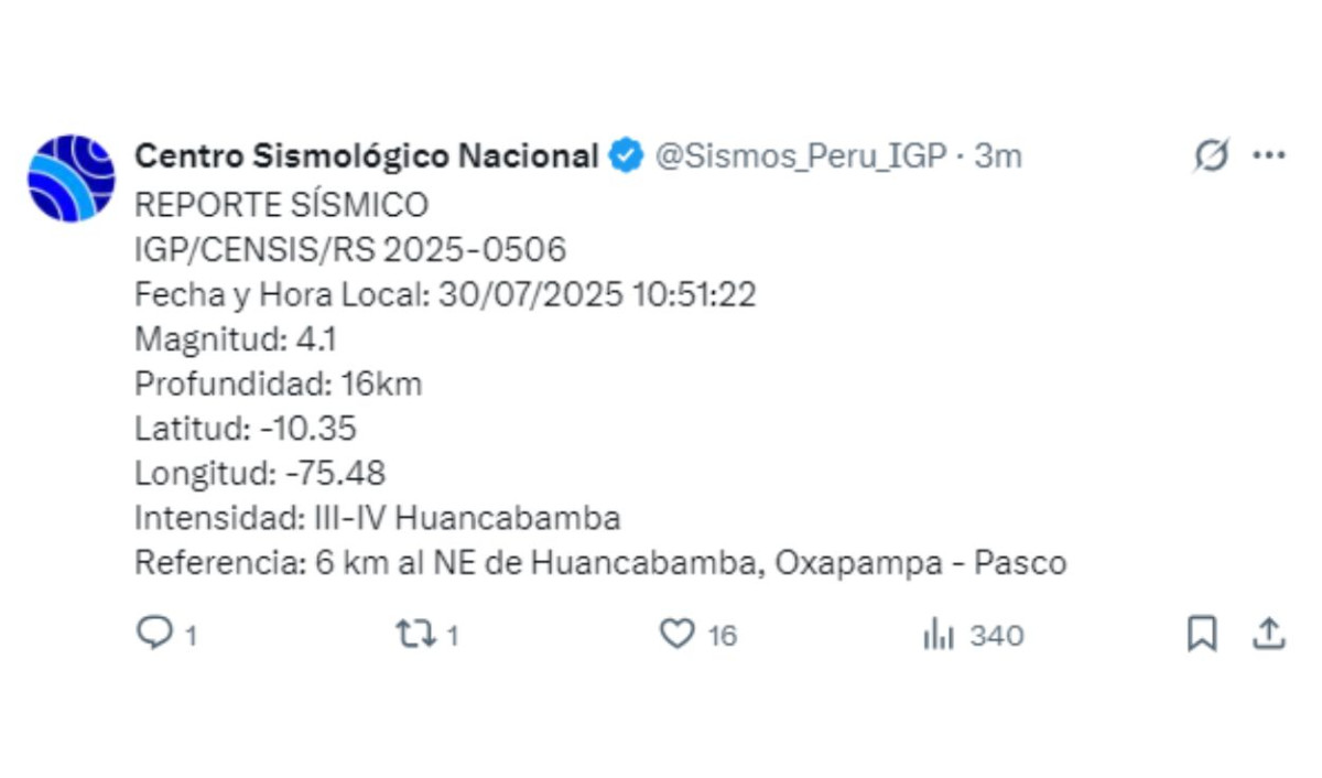 Un sismo de magnitud 4,1 se registró a las 10.51 a. m. a 6 kilómetros al noroeste de Huancabamba, Oxapampa en Pasco. El temblor del 30 de julio de 2025, se registró a una profundidad de 16 kilómetros, según informó el Instituto Geofísico del Perú (IGP) vía X. Recuerda tener siempre lista una mochila de emergencia para estar preparado ante un desastre natural.