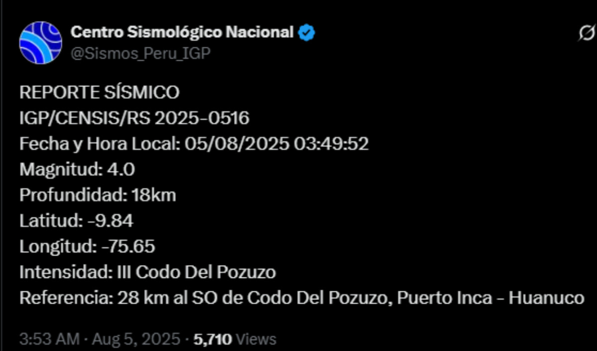 Temblor en Perú HOY, 5 de agosto, según IGP: ¿de qué magnitud fue el último sismo?