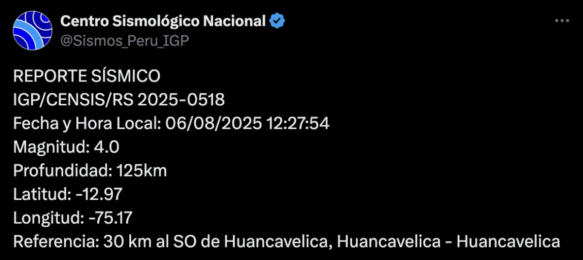 Un sismo de magnitud 4,0 se registró a las 12.27 p. m. a 30 kilómetros al suroeste de Huancavelica. El temblor del 6 de agosto de 2025, se registró a una profundidad de 125 kilómetros, según informó el Instituto Geofísico del Perú (IGP) vía Twitter. Recuerda tener siempre lista una mochila de emergencia para estar preparado ante un desastre natural.
