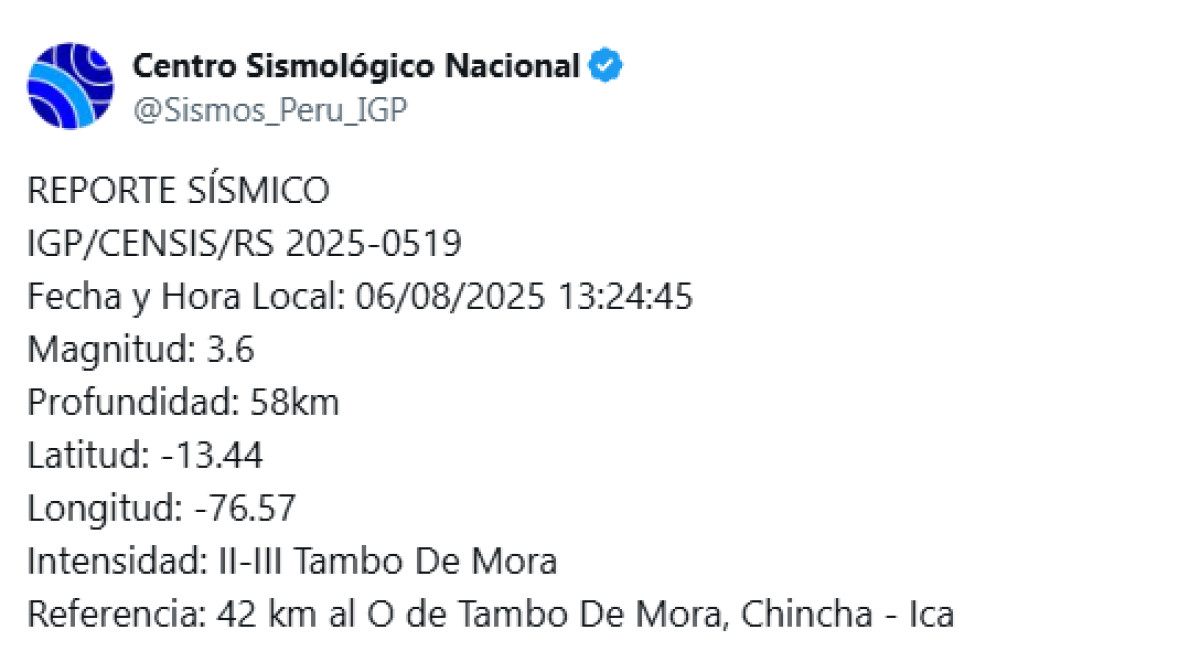 Un sismo de magnitud 3,6 se registró a las 1.24 p. m. a 42 kilómetros al oeste de Tambo De Mora, Chincha - Ica. El temblor del 6 de agosto de 2025, se registró a una profundidad de 58 kilómetros, según informó el Instituto Geofísico del Perú (IGP) vía Twitter. Recuerda tener siempre lista una mochila de emergencia para estar preparado ante un desastre natural.