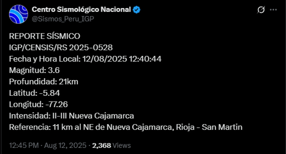 Un último sismo de magnitud 3,6 se registró este martes 12 de agosto 12:40 p.m. en la provincia de San Martín. El movimiento telúrico ocurrió a 11 al NE de la ciudad Nueva Cajamarca, Rioja.