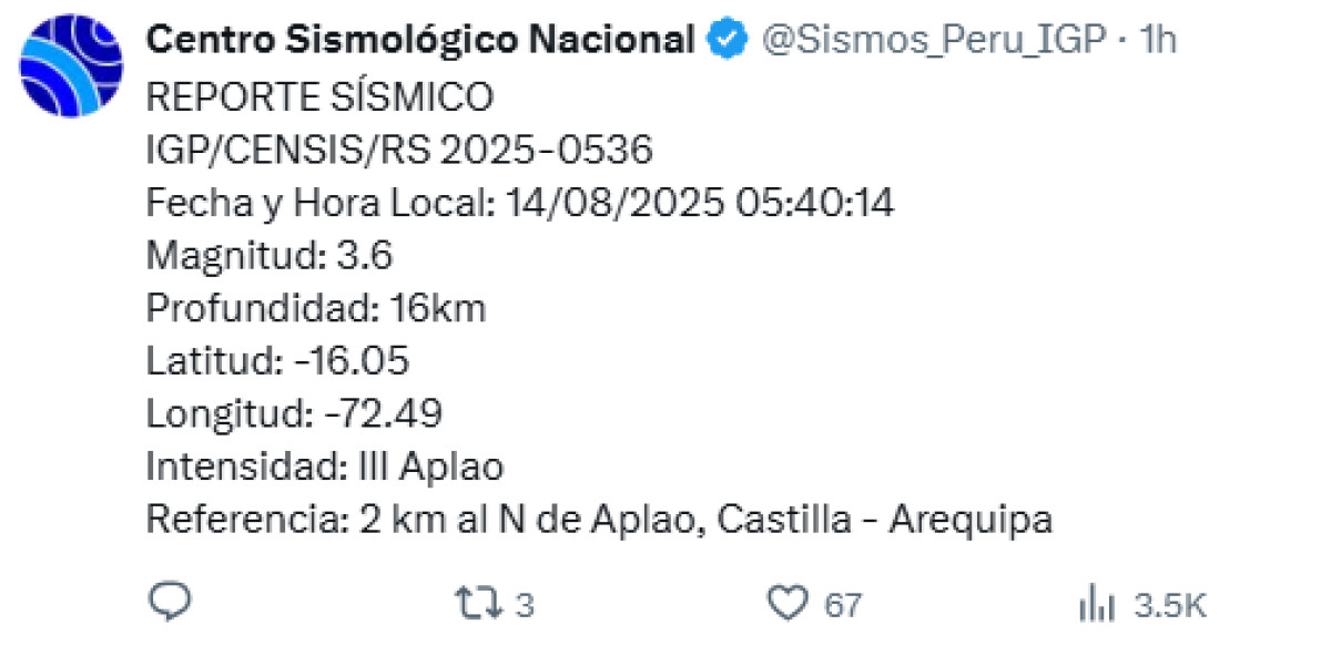 Un sismo de magnitud 3,6 se registró en la región de Arequipa a las 5:40 a.m. El movimiento telúrico tuvo origen a dos kilómetros al norte de la ciudad de Aplao, Castilla.