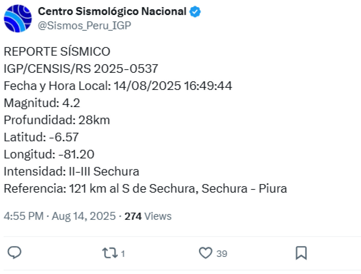 Un sismo de magnitud 4,2 se registró en la región de Piura a las 16:49 p.m. El movimiento telúrico tuvo origen a 121 kilómetros al sur de Sechura, según reportó el Centro Sismológico Nacional.
