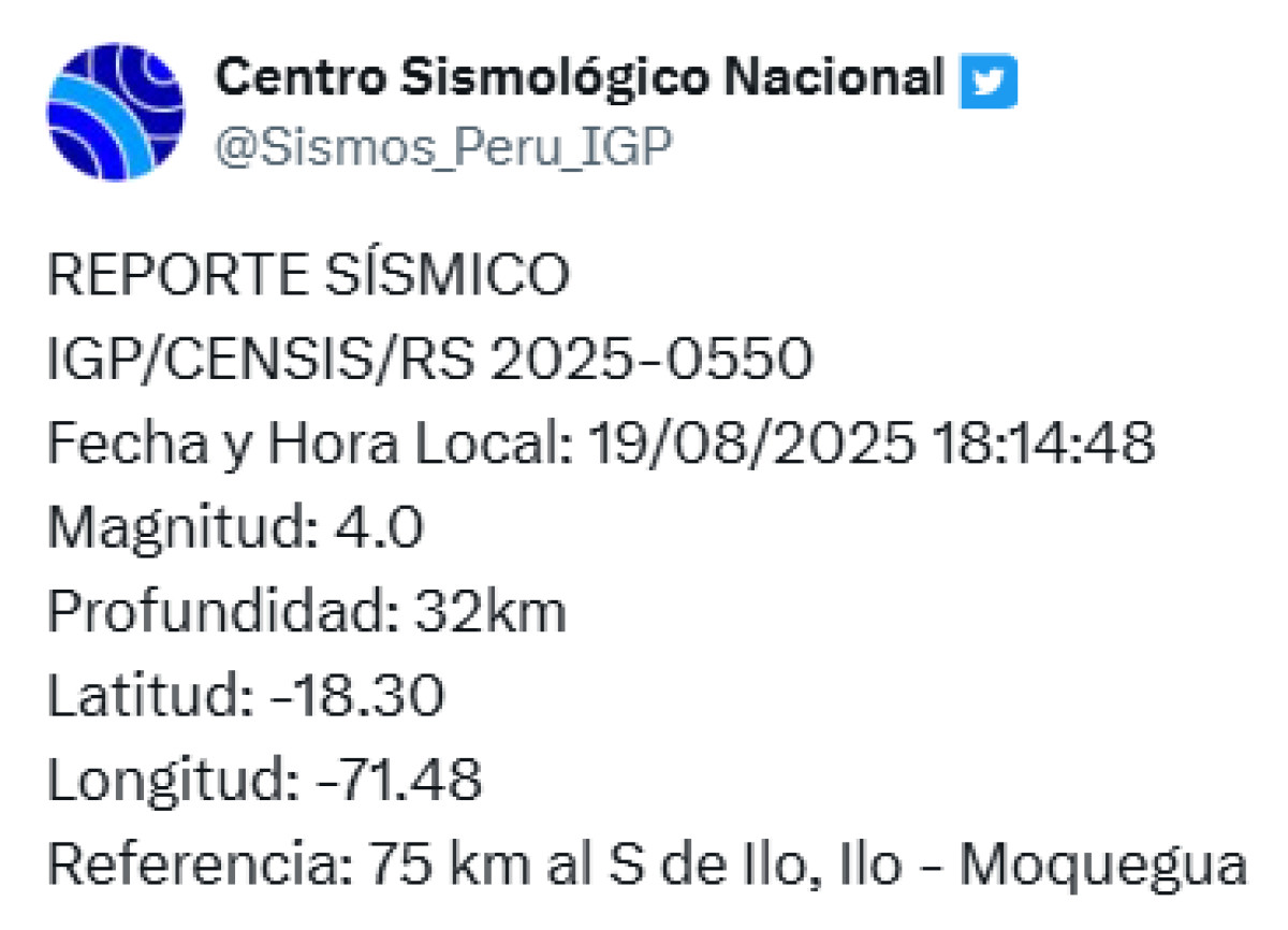 Un sismo de magnitud 4,0 se registró a las 06.14 p. m. a 75 kilómetros al sur de Ilo, en la provincia de Moquegua. El temblor del 19 de agosto de 2025 ocurrió a una profundidad de 32 kilómetros, según informó el Instituto Geofísico del Perú (IGP) vía X. Recuerda tener siempre lista una mochila de emergencia para estar preparado ante un desastre natural.