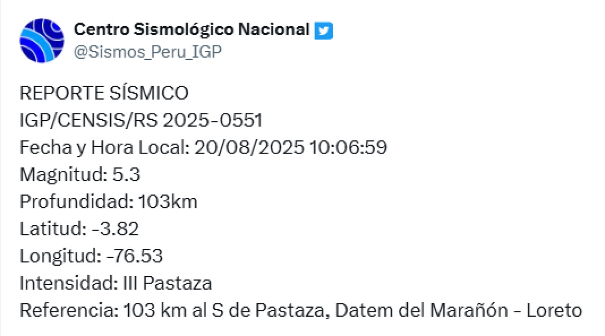 Un sismo de magnitud 5,3 se registró a las 10.06 a. m. a 103 kilómetros al sur de Pataza, Datem del Marañón, Loreto. El temblor del 20 de agosto de 2025, se registró a una profundidad de 103 kilómetros, según informó el Instituto Geofísico del Perú (IGP) vía X. Recuerda tener siempre lista una mochila de emergencia para estar preparado ante un desastre natural.