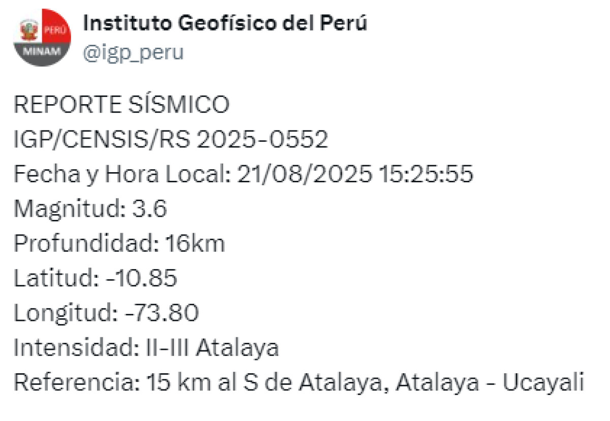 Un sismo de magnitud 3,6 se registró a las 15:25 p. m. a 15 kilómetros al suroeste de Atalaya, Ucayali. El temblor del 21 de agosto de 2025, se registró a una profundidad de 16 kilómetros, según informó el Instituto Geofísico del Perú (IGP) vía Twitter. Recuerda tener siempre lista una mochila de emergencia para estar preparado ante un desastre natural.