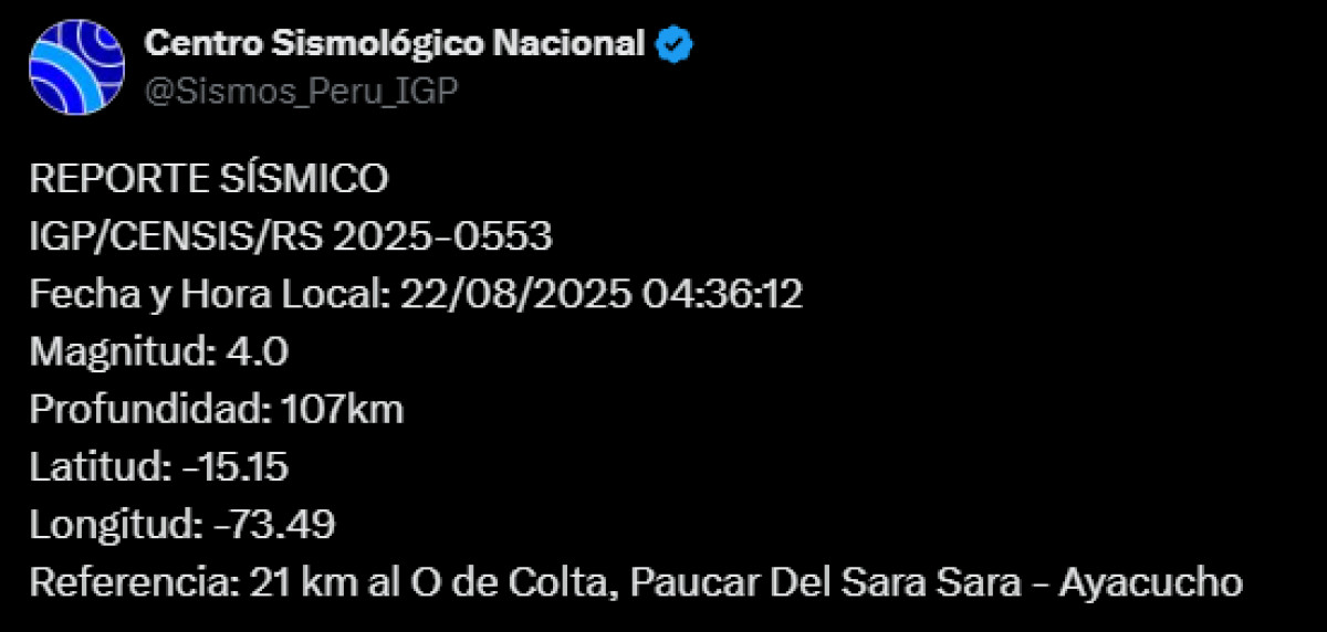 Un sismo de magnitud 4,0 se registró a las 4.36 a. m. a 21 kilómetros al oeste de Colta, Paucar Del Sara, Ayacucho. El temblor del 22 de agosto de 2025, se registró a una profundidad de 107 kilómetros, según informó el Instituto Geofísico del Perú (IGP) vía X. Recuerda tener siempre lista una mochila de emergencia para estar preparado ante un desastre natural.