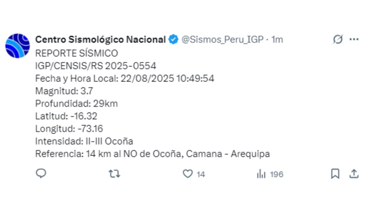 Un sismo de magnitud 3,7 se registró a las 10.49 a. m. a 21 kilómetros al noroeste de Ocoña, Camana, Arequipa. El temblor del 22 de agosto de 2025, se registró a una profundidad de 29 kilómetros, según informó el Instituto Geofísico del Perú (IGP) vía X. Recuerda tener siempre lista una mochila de emergencia para estar preparado ante un desastre natural.