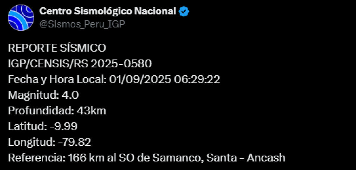 A las 06:29 a.m. de este lunes 1 de setiembre, la ciudad de Áncash registró un sismo de magnitud 4,0. El epicentro se dio a 166 km al suroeste de Samanco, Santa, según el Centro Sismológico Nacional.