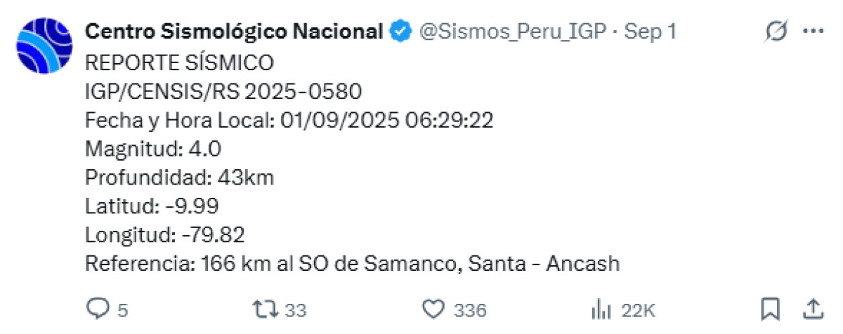 Un sismo de magnitud 4,0 se registró el último 1 de septiembre Anchas. El movimiento telúrico ocurrió a 166 km al sur oeste del distrito de Samanco.