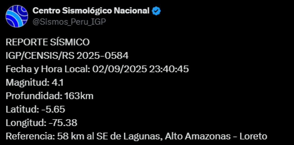 Un sismo de magnitud 4,1 se registró este 2 de septiembre en Loreto. El movimiento telúrico ocurrió a 58 km al suroeste del distrito de Lagunas, en Alto Amazonas.