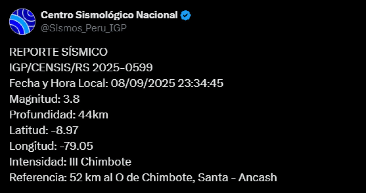 A las 23:34 a.m. de este lunes 8 de septiembre, el departamento de Áncash registró un sismo de magnitud 3,8. El epicentro se dio a 52 km al oeste de Chimbote, Santa, según el Centro Sismológico Nacional.