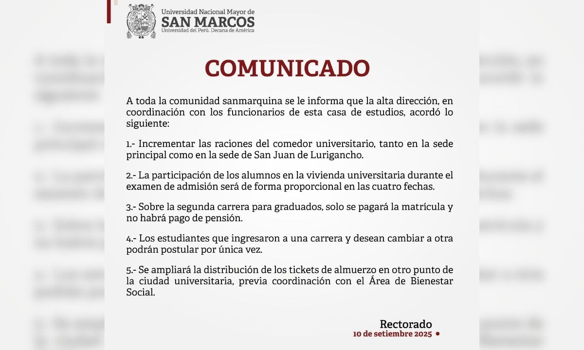Ante esta situación, la universidad informó la suspensión del examen de admisión 2026-I, previsto para los días 13, 14, 20 y 21 de septiembre, “hasta nuevo aviso”, debido a la toma de la ciudad universitaria. La Decana de América precisó que la medida, catalogada como “actos de violencia y vandalismo”, busca salvaguardar la seguridad e integridad de la comunidad universitaria. "Rechazamos absolutamente todo acto de violencia y acciones que nada tienen que ver con las legítimas protestas estudiantiles", señalaron en el pronunciamiento.