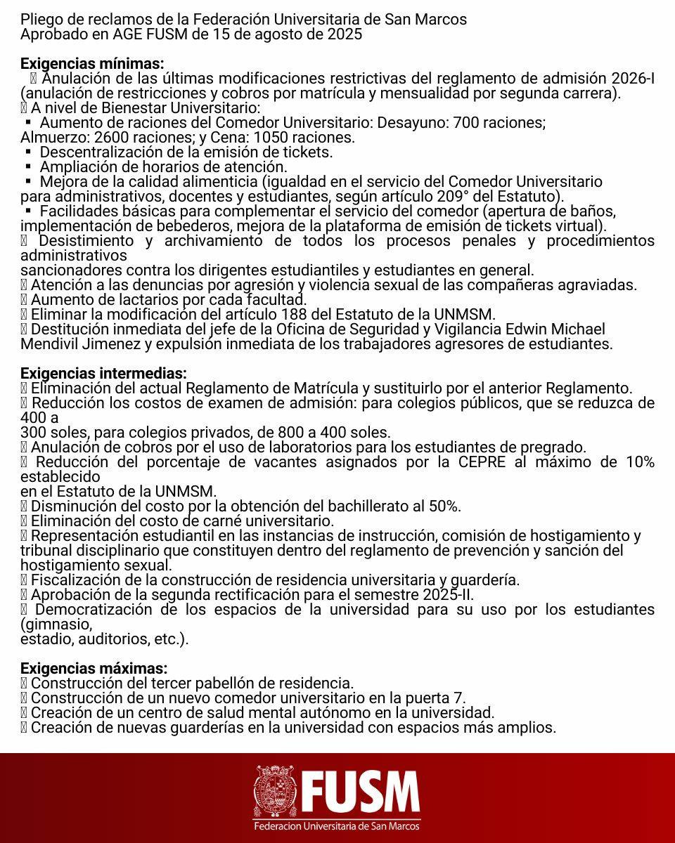La Federación Universitaria de San Marcos (FUSM) presentó el pliego de reclamos aprobado en la AGE FUSM del pasado 15 de agosto. Entre sus principales pedidos se encuentran: