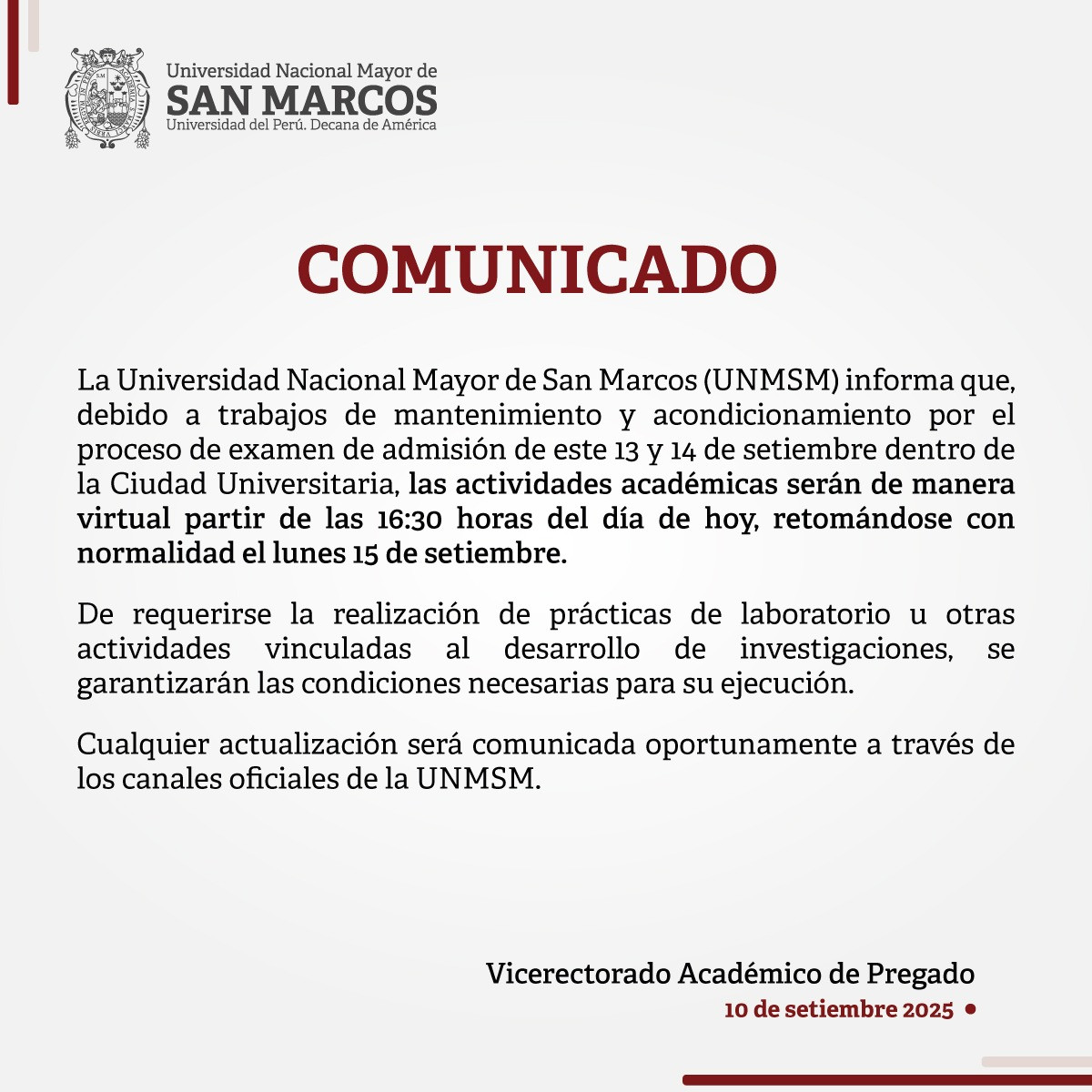 La Universidad Nacional Mayor de San Marcos (UNMSM) anunció la suspensión de clases presenciales del 10 al 15 de septiembre, alegando que se deben emprender trabajos de mantenimiento y acondicionamiento en la Ciudad Universitaria con motivo del examen de admisión 2026-I. Durante ese periodo, las clases se dictarán de forma virtual.