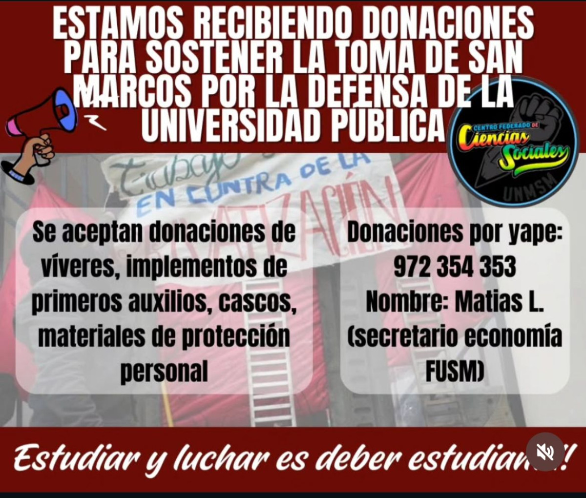 La toma de la Universidad Nacional Mayor de San Marcos continúa. La Federación Universitaria de la mencionada casa de estudios ha solicitado la donación de víveres, materiales de primeros auxilios o protección personal. Denuncian la privatización de la universidad.