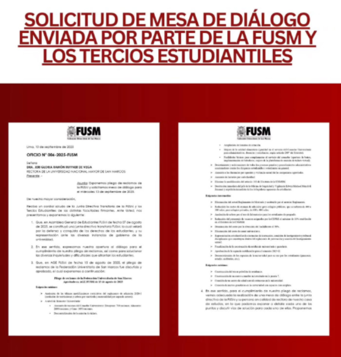Mediante un comunicado publicado en su cuenta de Instagram, la Federación Universitaria de San Marcos (FUSM) exhortó a los estudiantes a acudir a la puerta 2 para dar seguimiento a la segunda mesa de diálogo, en la que se espera alcanzar nuevos acuerdos con las autoridades sanmarquinas.