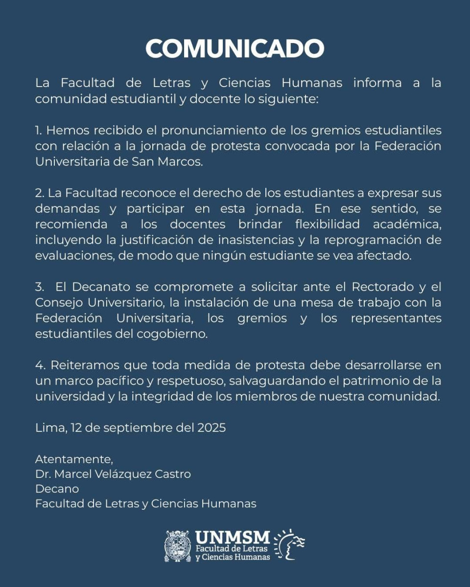 Tras la toma de la Universidad Nacional Mayor de San Marcos, la Facultad de Letras y Ciencias Humanas reconoció el derecho de los estudiantes en expresar sus demandas y participar en esta jornada. Por ello, la Facultad recomendó a los docentes a brindar flexibilidad académica, lo que incluye la justificación de inasistencias y reprogramación de las evaluaciones.