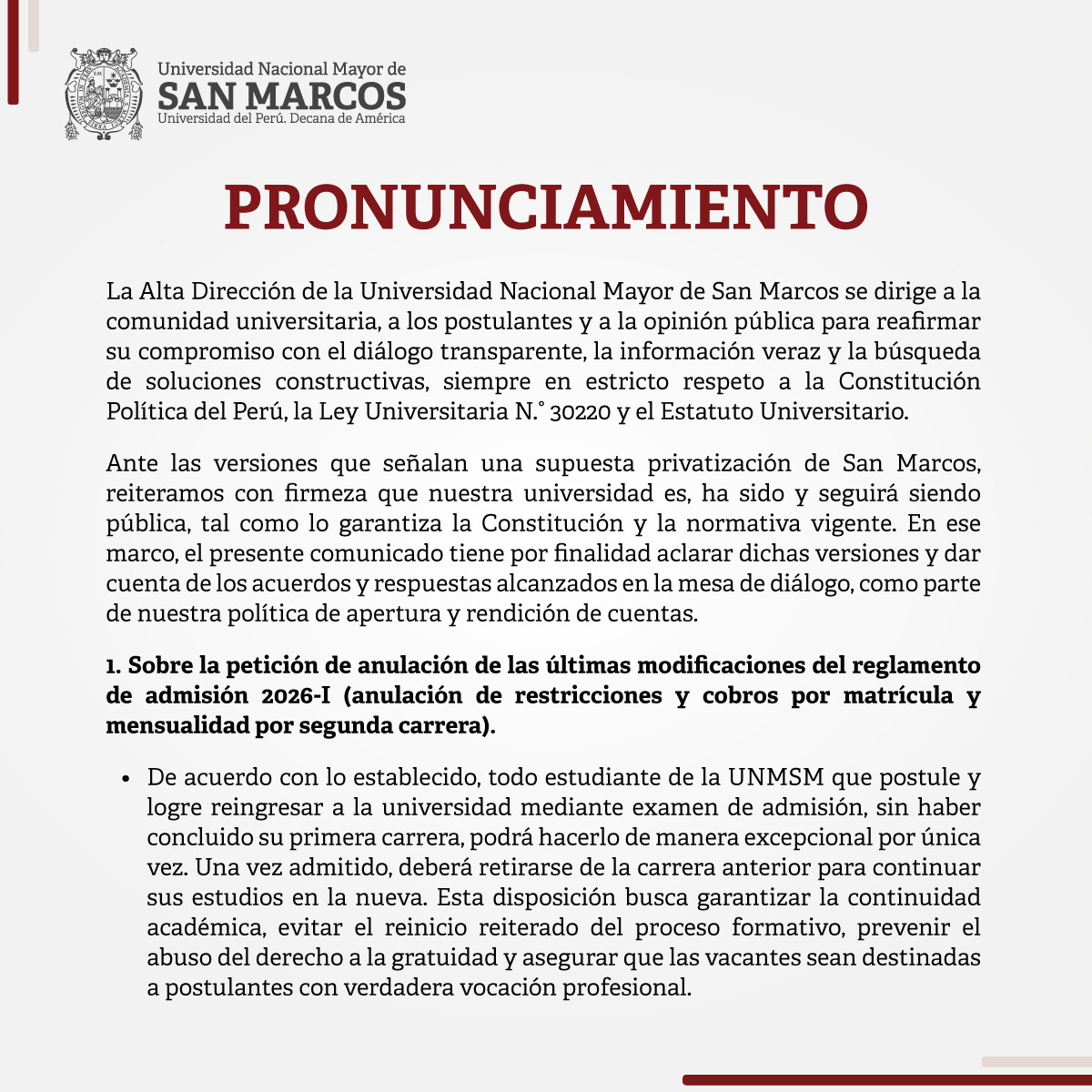 El oficialismo de Jerí rechaza la "supuesta privatización" que denuncian los estudiantes. Para leer en pronunciamiento completo, visite las cuentas oficiales de la UNMSM.