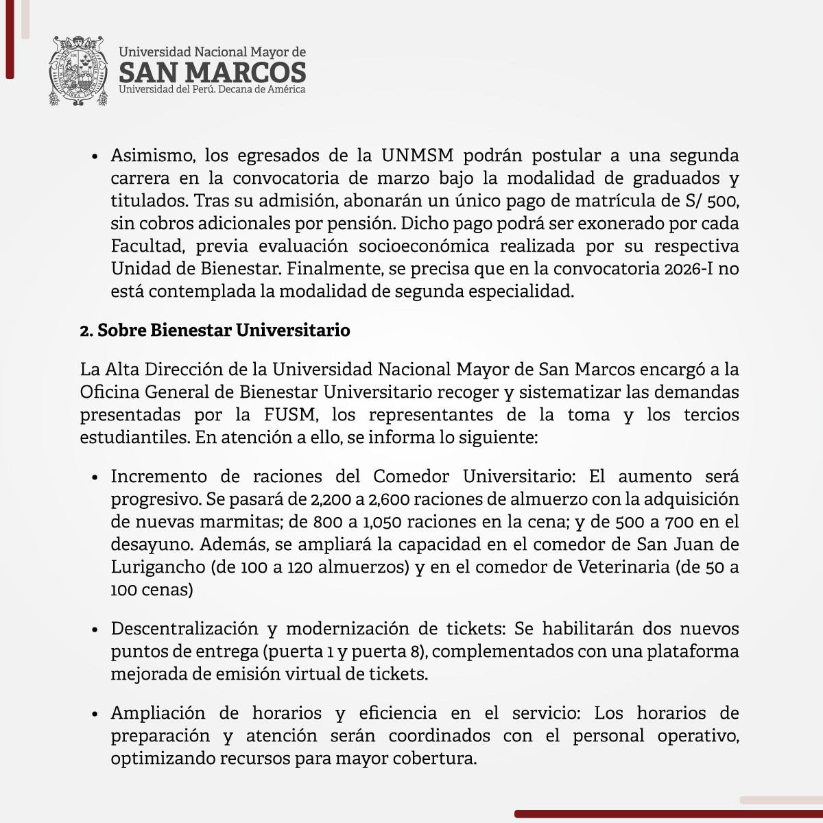 Tras la movilización, la universidad informó que, en coordinación con sus funcionarios, se acordó incrementar las raciones del comedor universitario en la sede central y en San Juan de Lurigancho. Además, se estableció que los graduados que cursen una segunda carrera solo pagarán matrícula y no pensión, se permitirá a los estudiantes cambiarse de carrera por única vez y se ampliará la distribución de tickets de almuerzo en otro punto de la ciudad universitaria, entre otras medidas.
