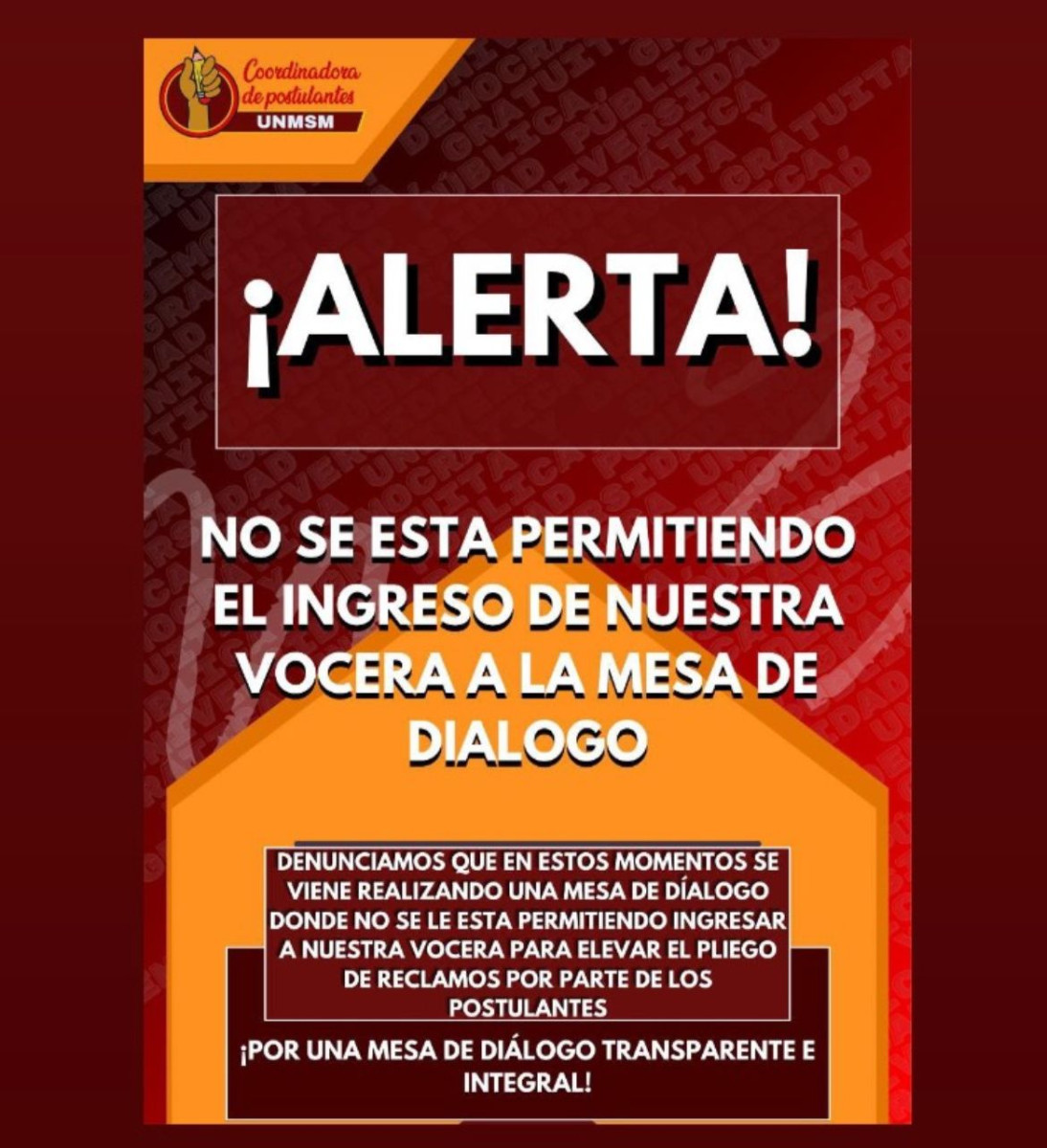 Desde la Coordinadora de postulantes de la UNMSM, se denuncia que no se ha permitido el ingreso de la vocera de la organización a la segunda mesa de diálogo convocada desde el rectorado.