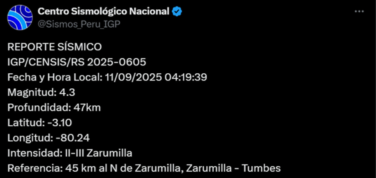 A las 04:19 a. m. de este jueves 11 de setiembre, la ciudad de Tumbes registró un sismo de magnitud 4,3. El epicentro se dio a 45 km al norte de Zarumilla, con una profundidad de 47 kilómetros, según el Centro Sismológico Nacional.