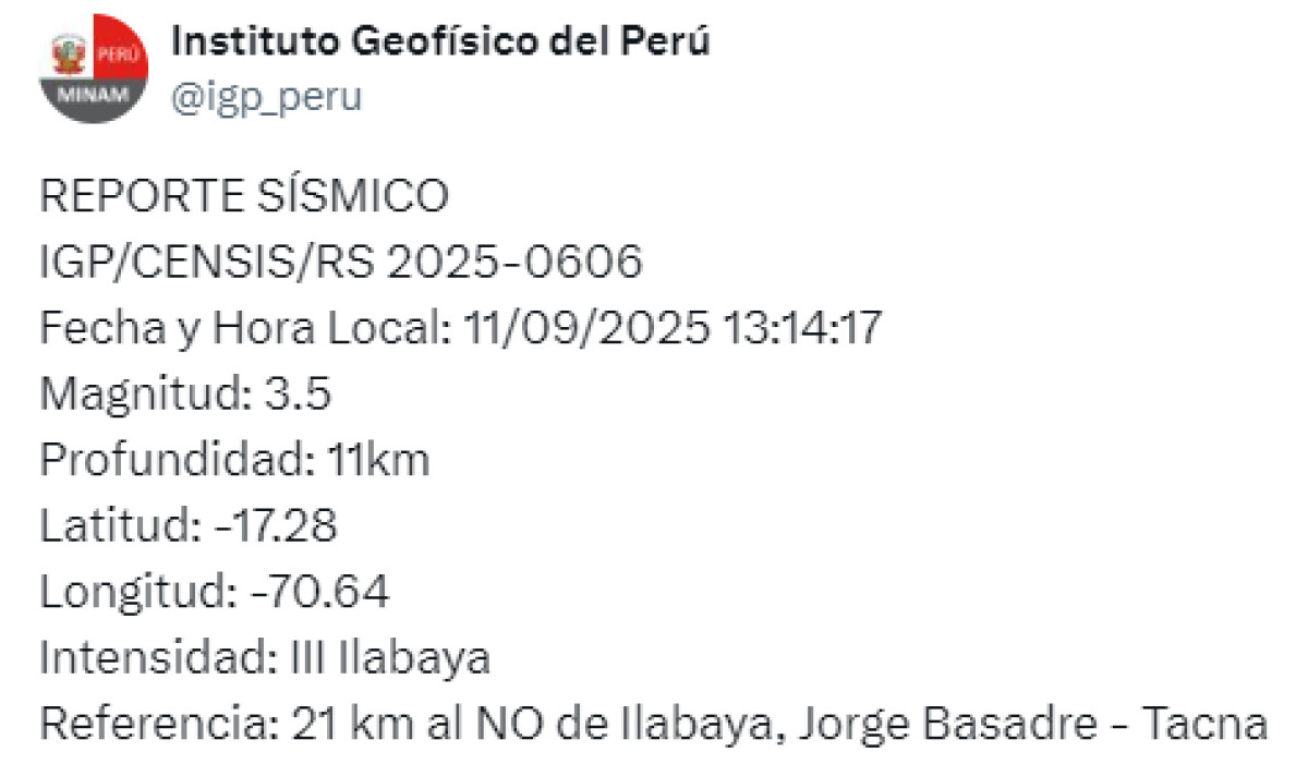 Un sismo de magnitud 3,5 se registró a las 13:14 p. m. a 21 kilómetros al noreste de Ilabaya, Tacna. El temblor del 11 de septiembre de 2025, se registró a una profundidad de 11 kilómetros, según informó el Instituto Geofísico del Perú (IGP) vía Twitter. Recuerda tener siempre lista una mochila de emergencia para estar preparado ante un desastre natural.