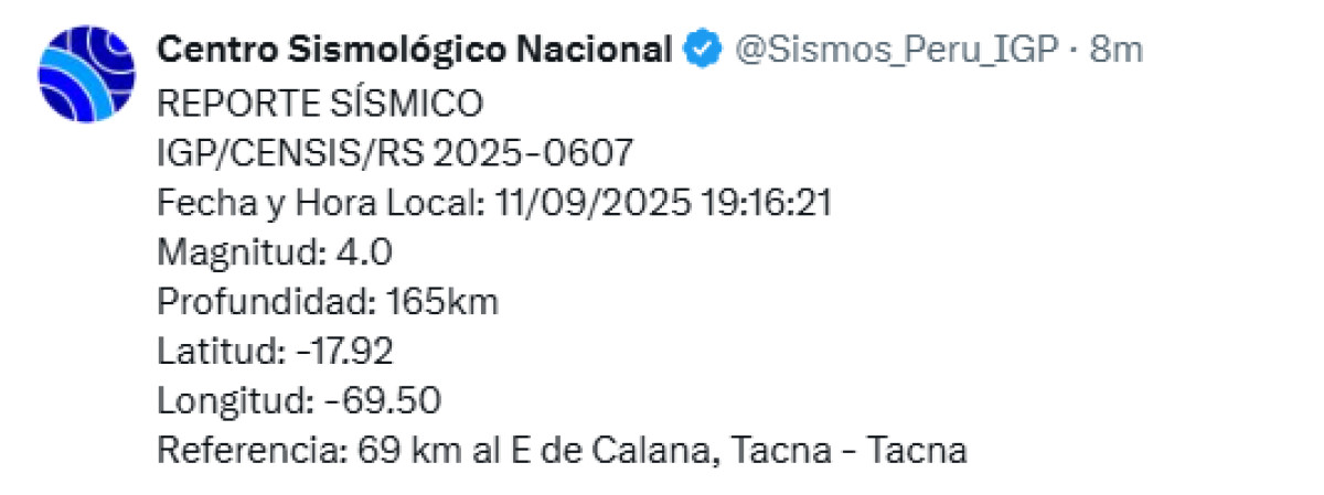 A las 7:16 P. m. de este jueves 11 de setiembre, la ciudad de Tacna registró un sismo de magnitud 4,0. El epicentro se dio a 69 km al este de Calana, Tacna - Tacna, con una profundidad de 165 kilómetros, según el Centro Sismológico Nacional.