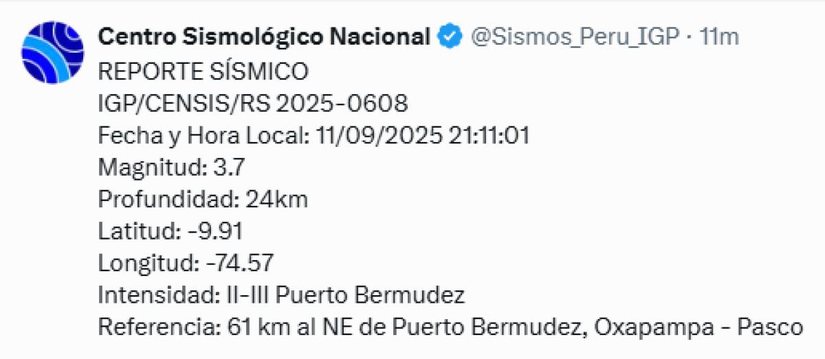 A las 9:11 P. m. de este jueves 11 de setiembre, la ciudad de Pasco registró un sismo de magnitud 3,7. El epicentro se dio a 61 km al noreste de Puerto Bermúdez, Oxapampa - Pasco, con una profundidad de 24 kilómetros, según el Centro Sismológico Nacional.